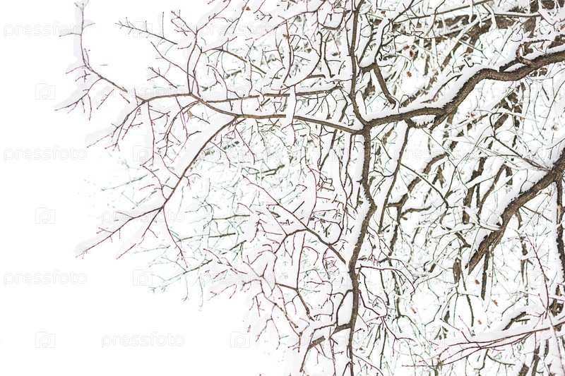Снежный орнамент из веток деревьев после снегопада. Зимняя текстура, естественный фон, копирайт