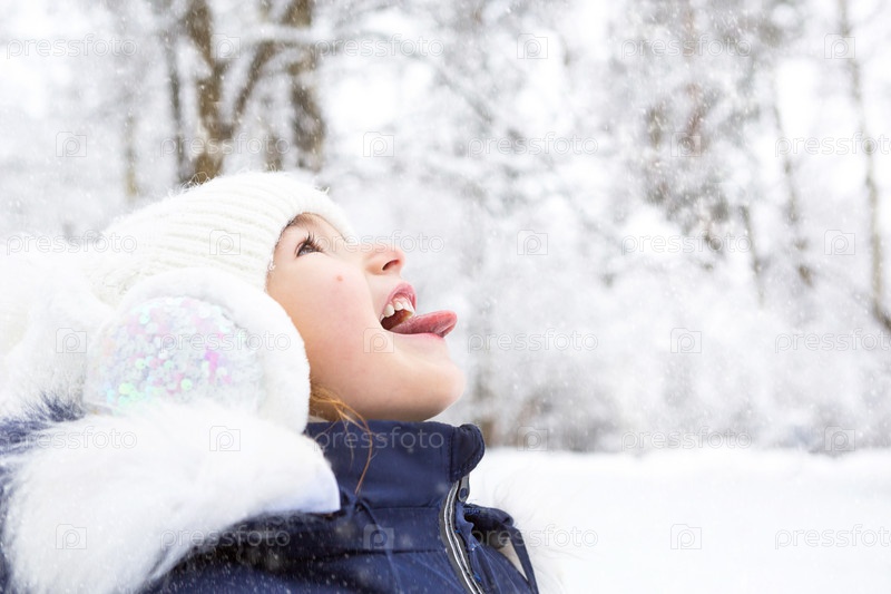 Маленькая девочка с высунутым языком зимой ловит снежинки в заснеженном лесу. Белая вязаная теплая шапка, меховые наушники с пайетками. Детская радость. Копировать пространство