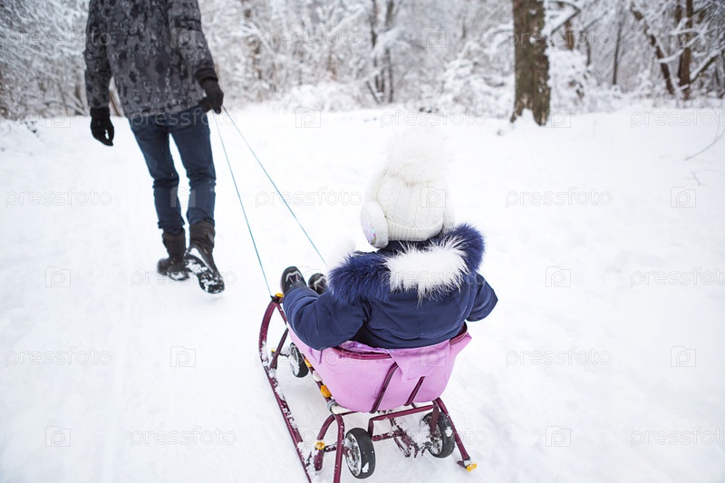 Папа везет свою маленькую дочь на санках в гору по зимнему снежному лесу. Активный семейный отдых на свежем воздухе