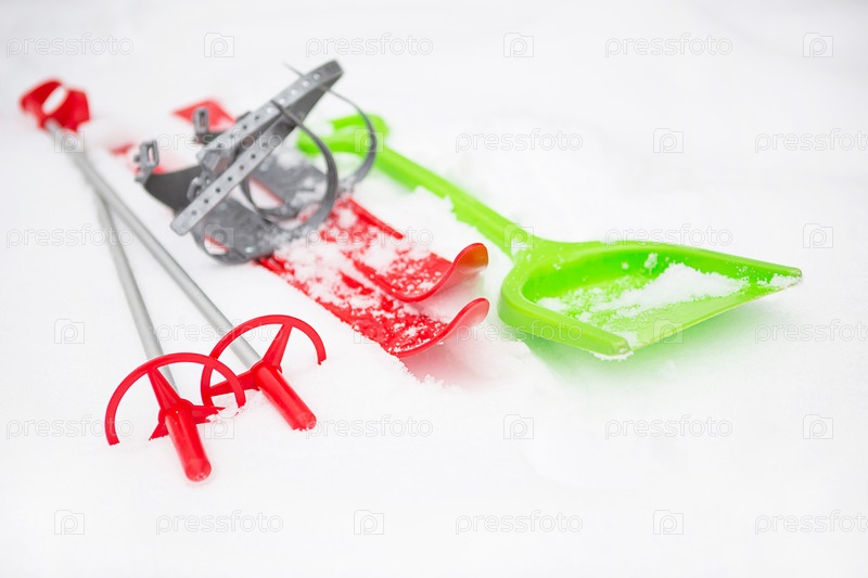 Детские красные лыжи с палками и зеленая лопата для снега - макет в снегу. Зимние мероприятия на свежем воздухе, семейные развлечения. Белый естественный морозный фон. Копировать пространство