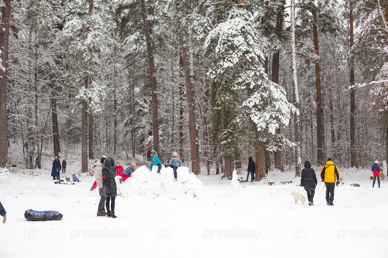 Люди гуляют по заснеженному зимнему лесу со своими семьями, на лыжах, санках, надувных тюбингах, скатываются с горки, строят крепость и снеговика. Зимние мероприятия на свежем воздухе. 22 ноября 2020 г. – Калуга, Россия