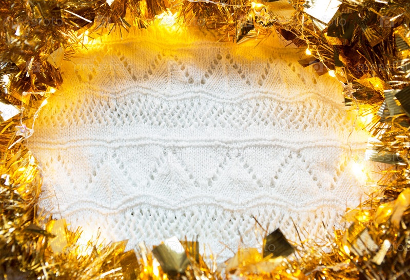 Праздничная рамка из золотой гирлянды с огнями и мишурой на белом вязаном фоне с рисунком, копирайтом. Новый год, Рождество, осень и зима согревают атмосферу