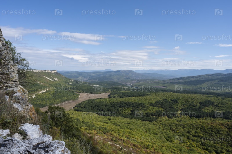 Вид на горы из пещерного города Мангуп-Кале в Республике Крым, Россия. Солнечный день 30 сентября 2020 г