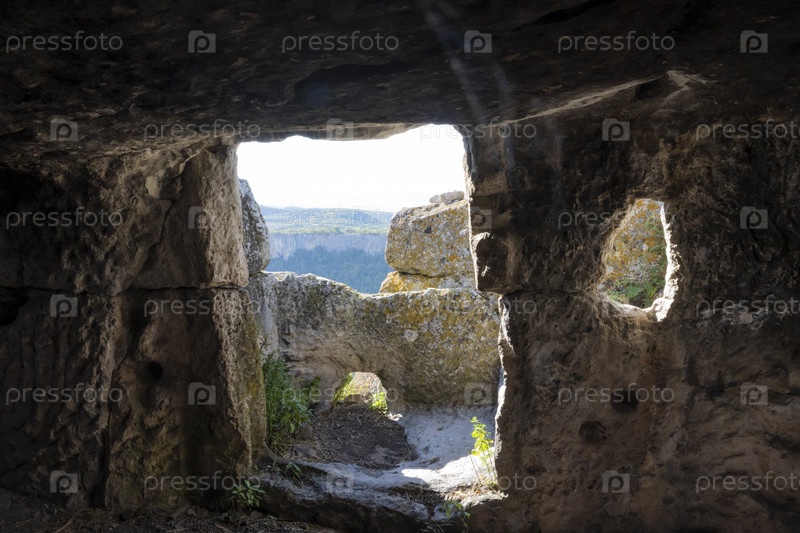 Пещерный город Тепе-Кермен в Республике Крым, Россия. Солнечный день 30 сентября 2020 г