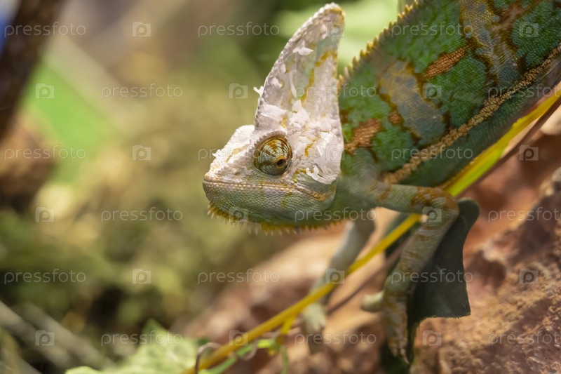 Зеленый хамелеон крупным планом сидит на ветке в зоопарке
