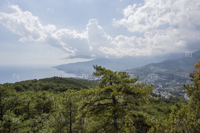 Вид на город Ялту сквозь деревья с высоты горы. Республика Крым, Россия. 8 октября 2020 г