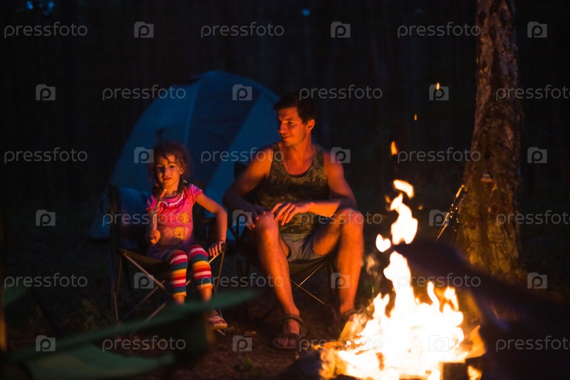 Папа и дочь сидят ночью у костра на открытом воздухе летом на природе. Семейный поход, посиделки у костра. День отца, барбекю. Кемпинговый фонарь и палатка