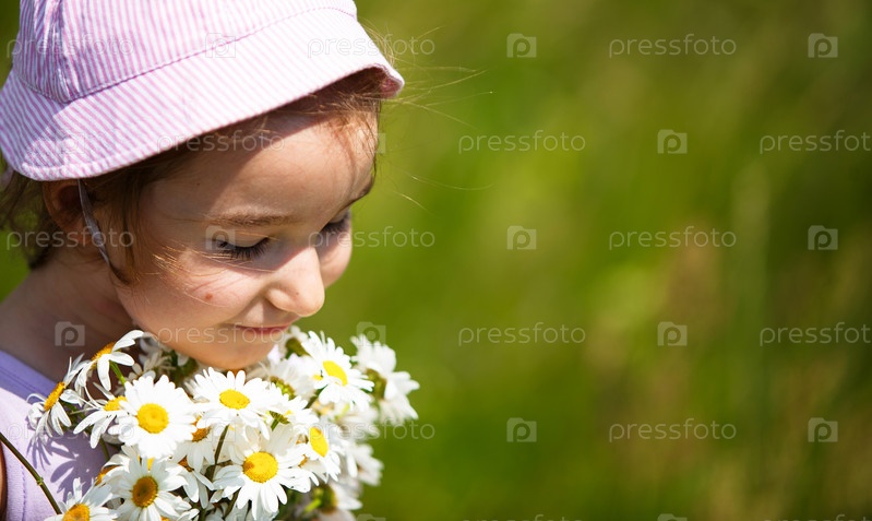 Маленькая девочка с букетом ромашек летом на естественном фоне. Счастливый ребенок, панама для защиты от солнца. Международный день защиты детей. Скопируйте пространство. Аутентичность, сельская жизнь, экологичность
