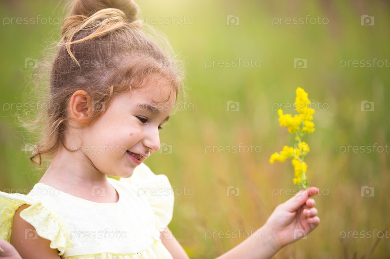 Портрет милой девушки в поле с диким цветком. Детство, каникулы на даче, свобода и беззаботность. Летнее время. Международный день защиты детей. Средство от комаров, коттеджный сердечник. Копировать пространство