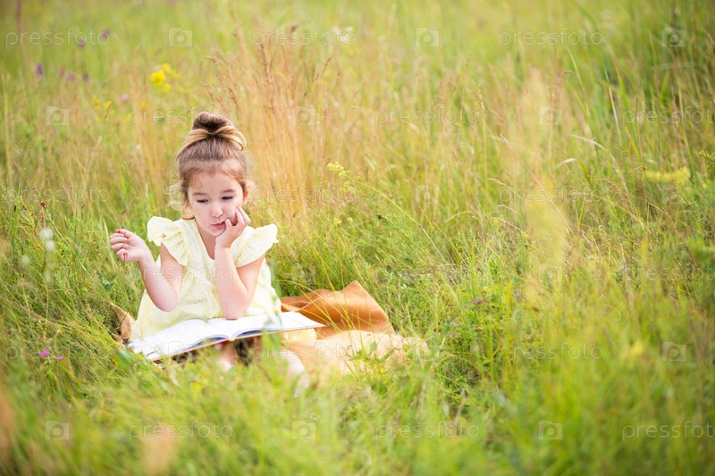 Девушка в желтом платье сидит в траве на одеяле в поле и читает бумажную книгу. Международный день защиты детей. Летнее время, детство, образование и развлечения, дачное ядро. Копировать пространство