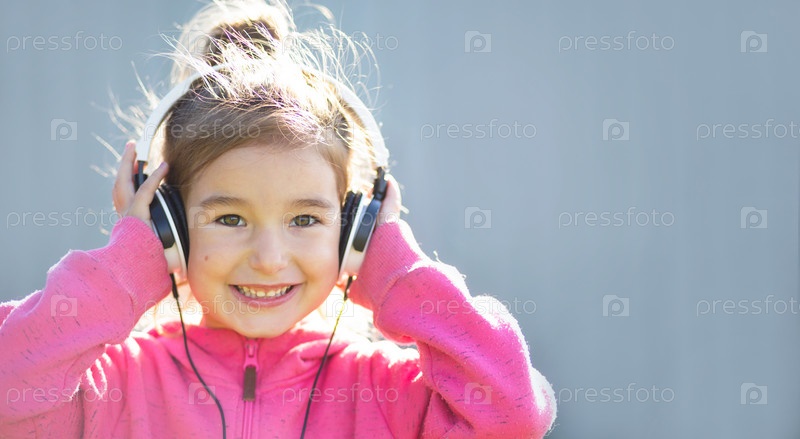 Веселая девушка в наушниках и розовой толстовке с капюшоном слушает музыку и смеется. Открытый, серый фон