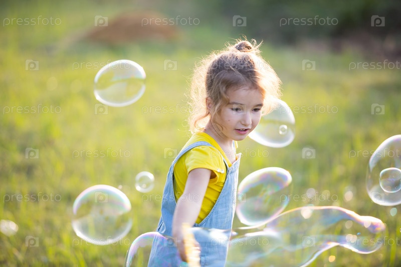 Девушка в джинсовом комбинезоне пускает мыльные пузыри летом в поле на закате. Международный день защиты детей, счастливый ребенок, мероприятия на свежем воздухе. Летний фон. Здоровый и экологичный образ жизни