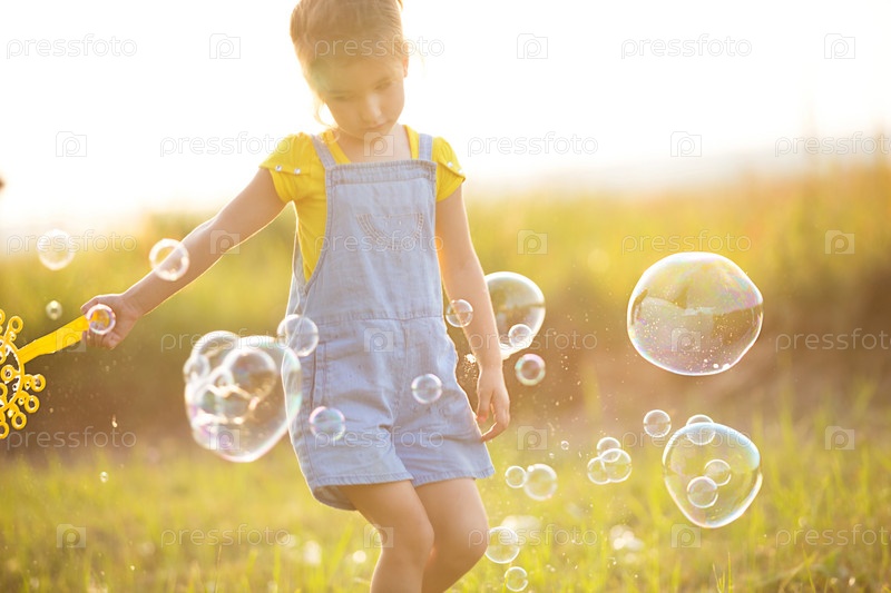 Девушка в джинсовом комбинезоне пускает мыльные пузыри летом в поле на закате. Международный день защиты детей, счастливый ребенок, мероприятия на свежем воздухе. Летний фон. Здоровый и экологичный образ жизни
