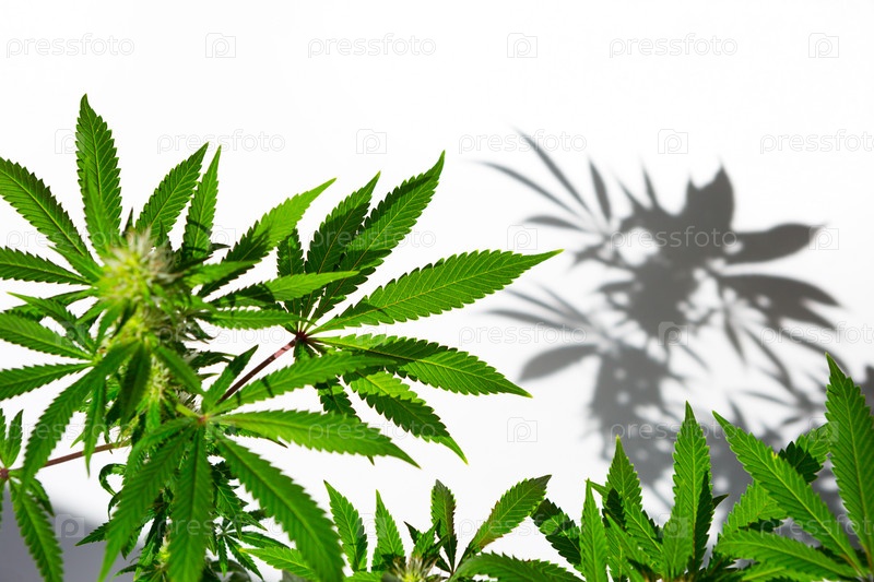 Куст конопли при ярком свете на белом фоне с тенью. Лекарственные листья марихуаны сорта Джек Херер представляют собой гибрид сативы и индики