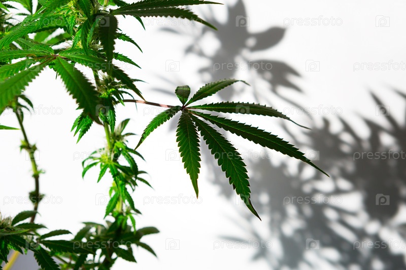 Куст конопли при ярком свете на белом фоне с тенью. Лекарственные листья марихуаны сорта Джек Херер представляют собой гибрид сативы и индики