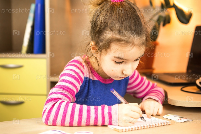 Дошкольница занимается дома за столом, изучает образовательную программу, пишет в тетради. Домашние задания, школьные уроки. Дистанционное обучение, образование, изучение языков. Копировать пространство