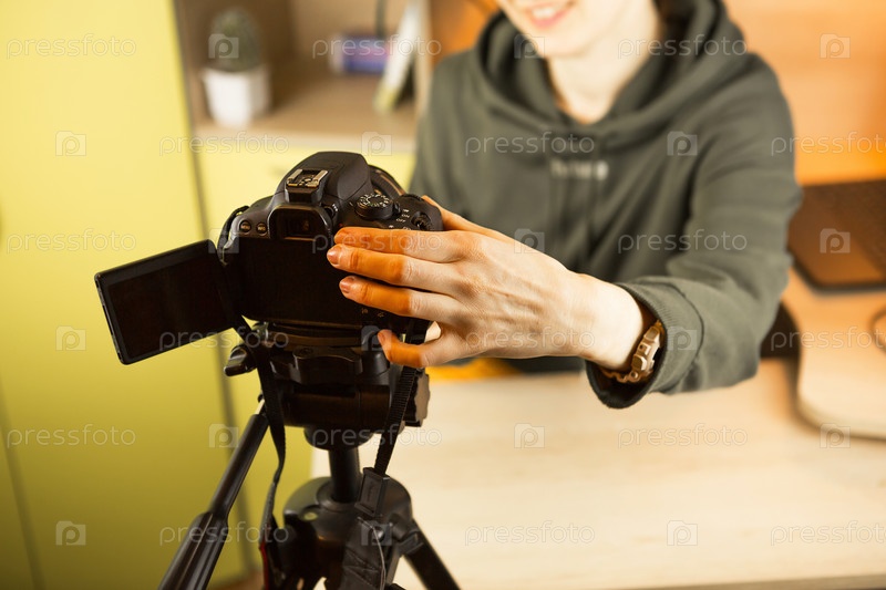 Женщина ведет прямой эфир влога, записывает видео на камеру из дома. Удаленное общение, новая реальность, блоггинг, видеоконференцсвязь