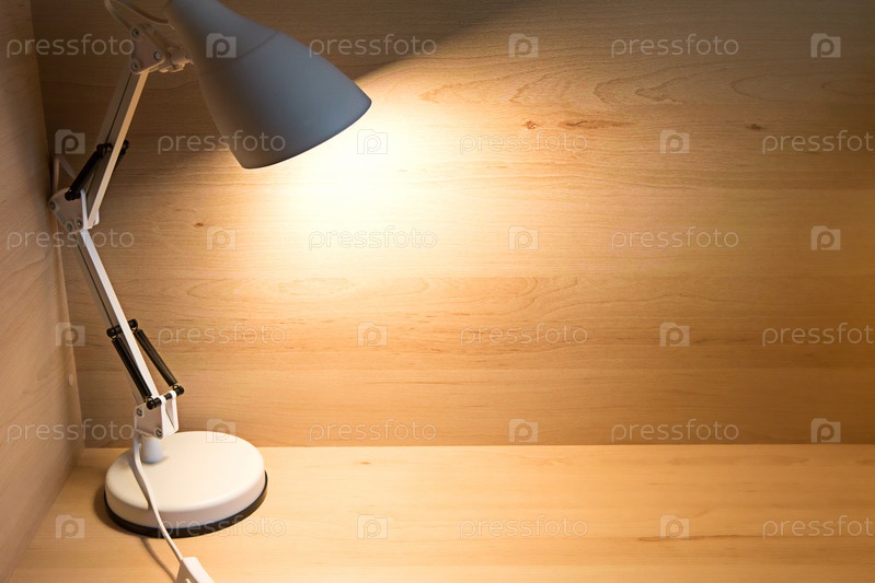 Настольная лампа в стиле лофт на рабочем месте дома. Место, где студент может учиться, работать удаленно. Фон, копирайт