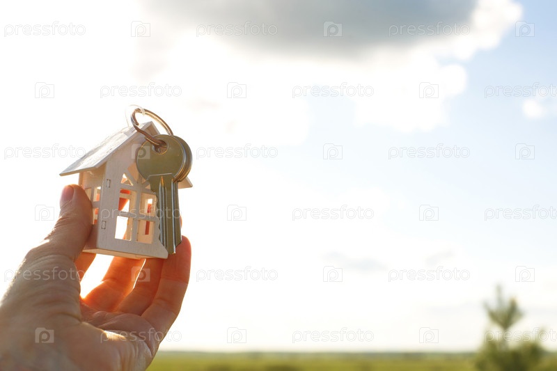 Белая деревянная фигура дома и ключи в руке на фоне неба и поля. Мечта о своем доме, строительство коттеджа в деревне, план и дизайн, сдача проекта, переезд в новый дом