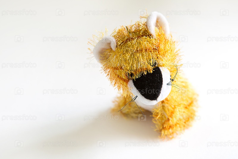 Мягкая игрушка тигренок. Детский игрушечный тигр с пушистым мехом на белом фоне. Место для текста