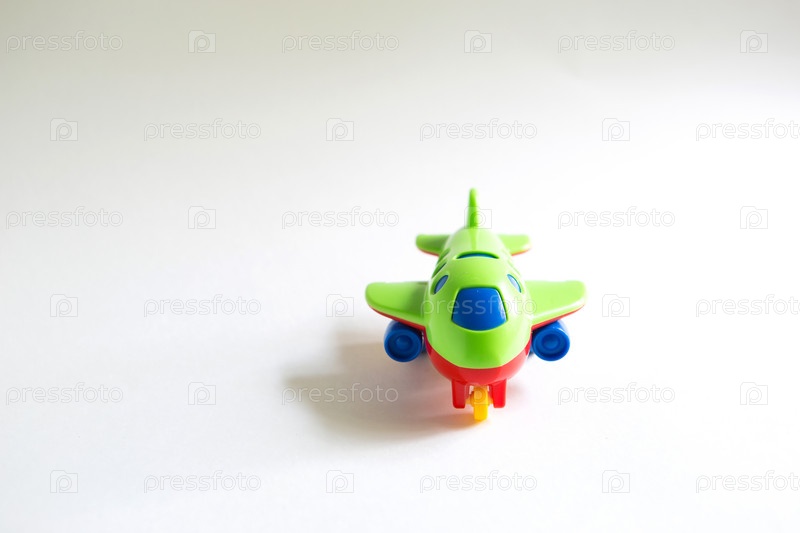 Игрушечный зеленый пластиковый самолет с цветными красными, синими, желтыми деталями на белом фоне. Игрушка для ребенка, концепция туризма и путешествий, авиаперевозки. Место для текста