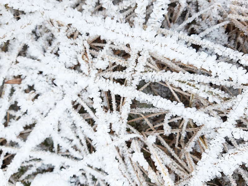 Кристаллы льда на сухой траве. Морозный узор в природе зимой от мороза и снега. Фон, место для текста