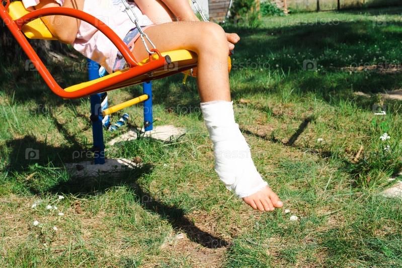 Детские ножки забинтованы гипсом - босиком на качелях. Травматическое оборудование, детская травма, ушиб, растяжение связок, перелом