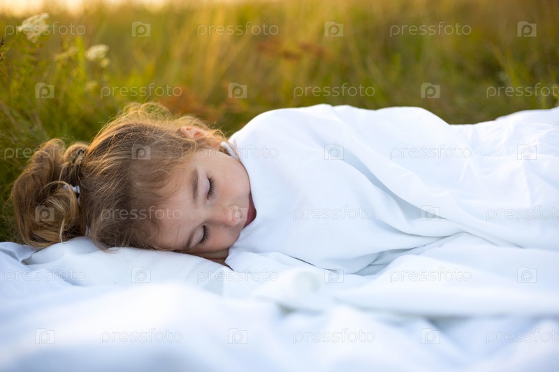 Девушка спит на белом постельном белье на природе в траве, на свежем воздухе. Защита от комаров, здоровый сон, польза проветривания, закаливание, чистая природа, экология, здоровье детей