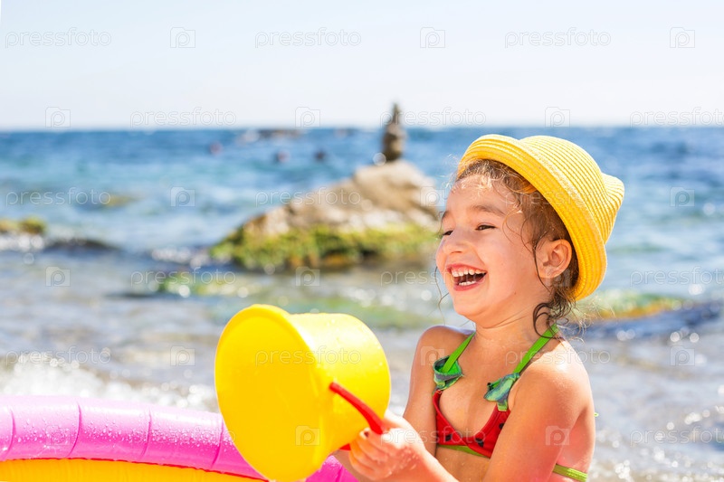 Девушка в желтой соломенной шляпе играет на открытом воздухе у моря, в воде с ведром в надувном бассейне на пляже. Несмываемые средства для защиты детской кожи от солнца, солнечных ожогов. курорт на берегу океана