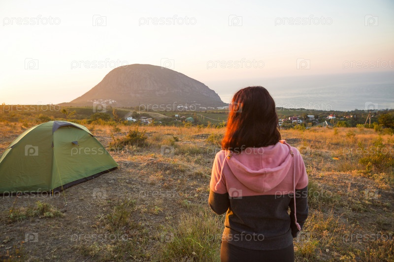 Женщина встречает рассвет в горах, радуется солнцу. Панорамный вид на горы и море сверху. Кемпинг, активный отдых, спортивный горный туризм, семейный отдых. Аю-Даг, Крым