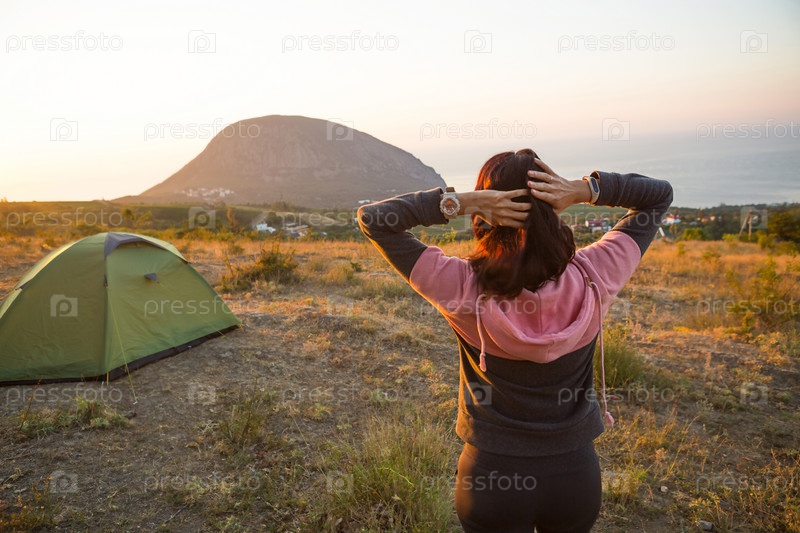 Женщина встречает рассвет в горах, радуется солнцу. Панорамный вид на горы и море сверху. Кемпинг, активный отдых, спортивный горный туризм, семейный отдых. Аю-Даг, Крым