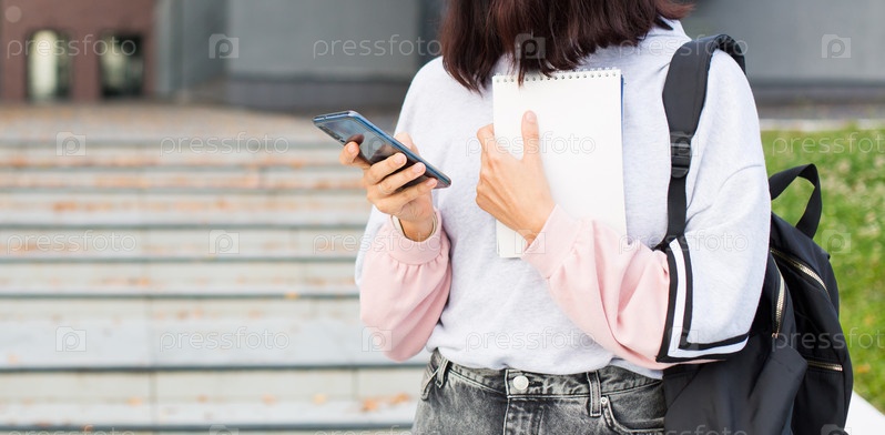 Студентка с черным рюкзаком держит смартфон и блокнот на пороге университета. Высшее образование, начало учебного года, возвращение в школу, гаджеты. Копипространство
