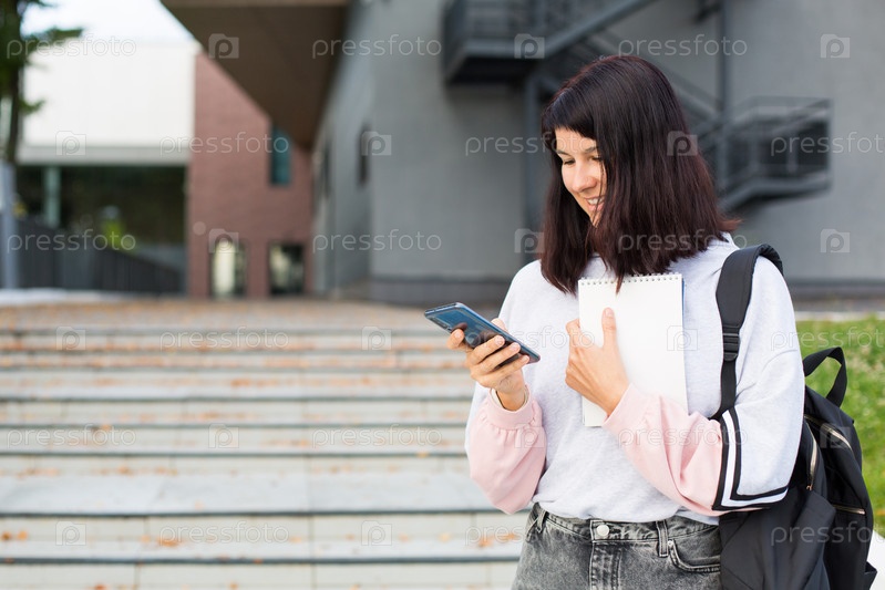 Студентка с черным рюкзаком держит смартфон и блокнот на пороге университета. Высшее образование, начало учебного года, возвращение в школу, гаджеты. Копипространство