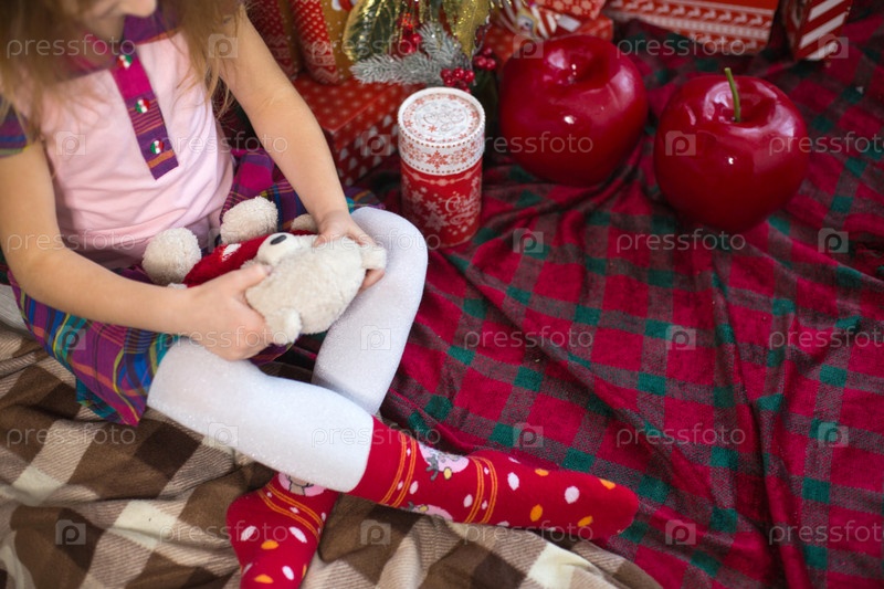 Маленькая девочка держит плюшевого мишку, сидит на пледе в рождественских украшениях возле елки с коробками подарков и шляпой Санты. Новый год, детская игра