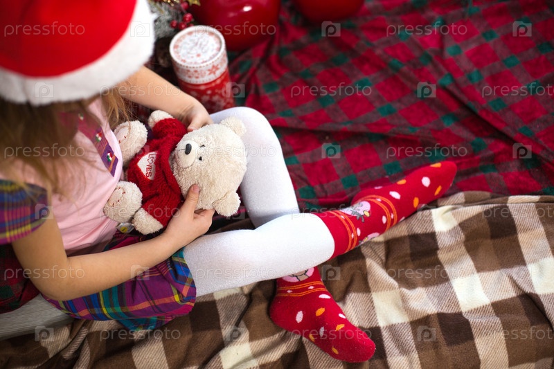 Маленькая девочка держит плюшевого мишку, сидит на пледе в рождественских украшениях возле елки с коробками подарков и шляпой Санты. Новый год, детская игра