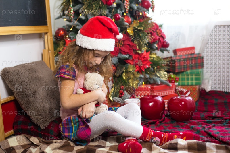 Маленькая девочка держит плюшевого мишку, сидит на пледе в рождественских украшениях возле елки с коробками подарков и шляпой Санты. Новый год, детская игра