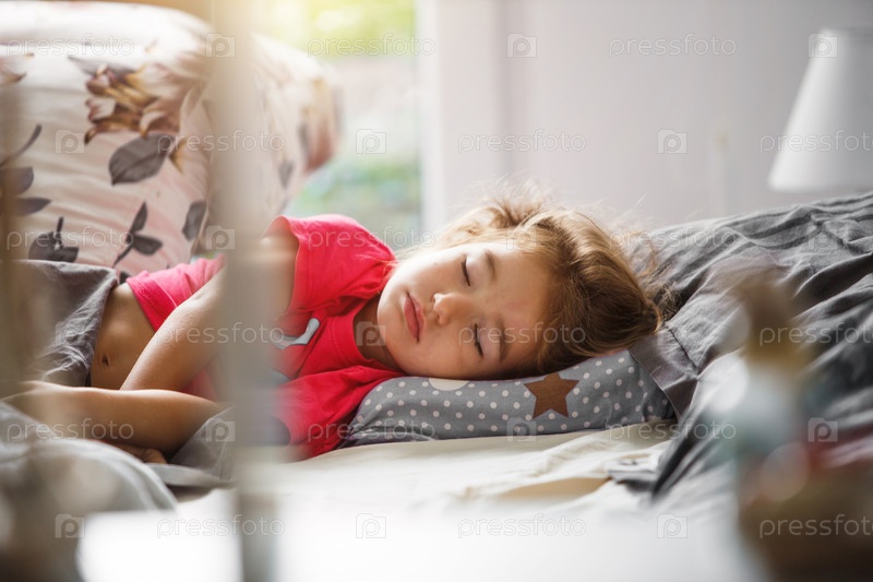 В его кроватке сладко спит маленький ребенок. Здоровый сон девушки, вентиляция. Утро, просыпайся, солнечный свет из окна. Ранний подъем в детский сад, школу