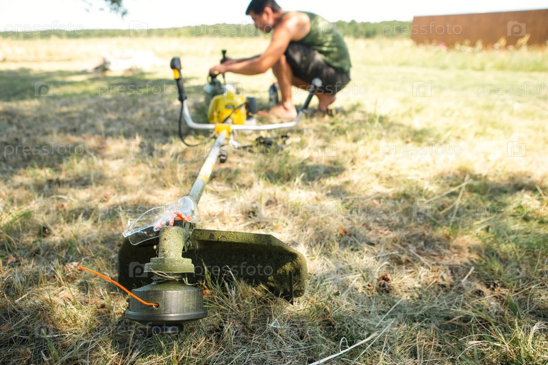 Мужчина устанавливает триммер после скашивания травы крупным планом. Бензонасос на траве в защитных очках. Ландшафтный дизайн и благоустройство садового участка, уход за газоном