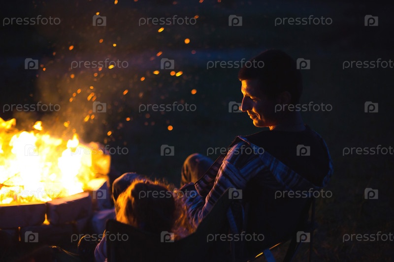 Папа и дочь сидят ночью у костра на открытом воздухе летом на природе. Семейный поход