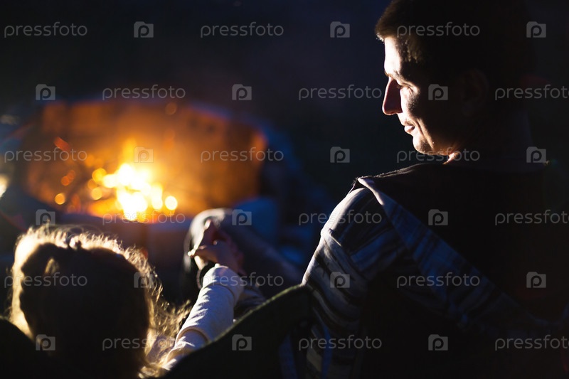 Папа и дочь сидят ночью у костра на открытом воздухе летом на природе. Семейный поход