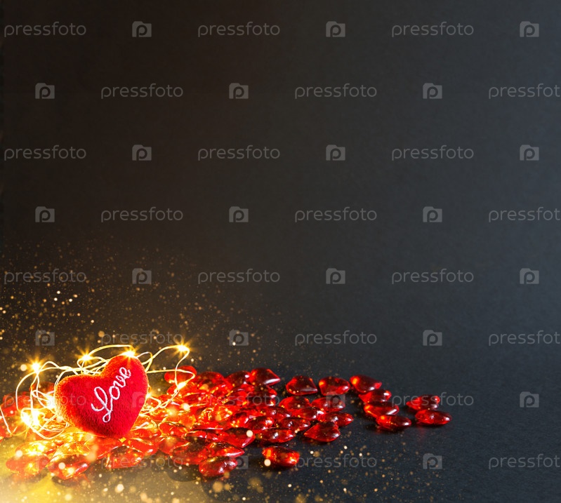 Красные стеклянные сердца и мягкое плюшевое сердце со словами Любовь на черном фоне, золотые огни - День святого Валентина. Праздник, баннер, копирайт. Шоппинг и подарок, подарок любимому человеку, влюбленной паре