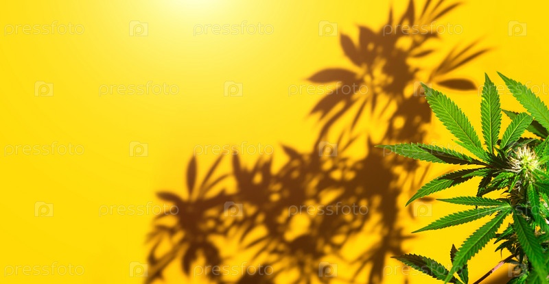 Куст конопли при ярком свете на желтом фоне с тенью. Лекарственные листья марихуаны сорта Джек Херер представляют собой гибрид сативы и индики. Выращивание домашнего растения