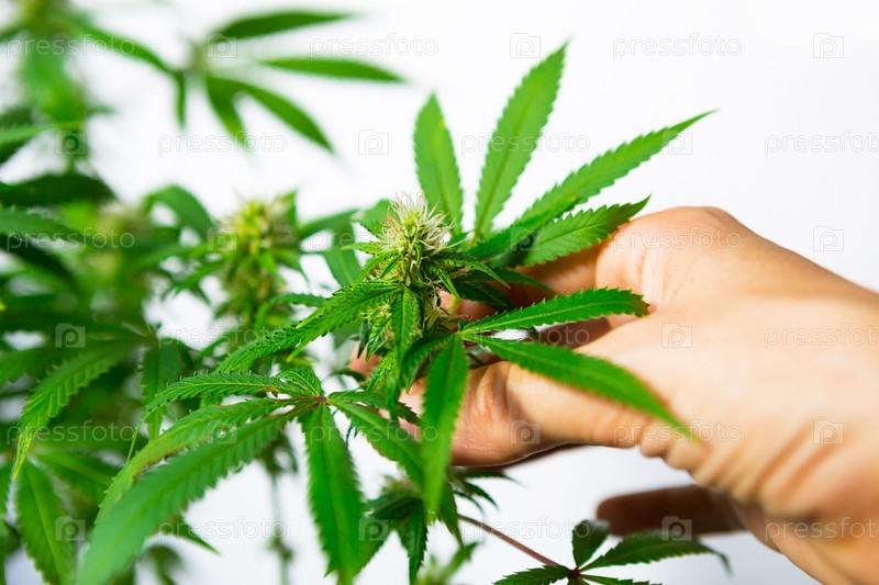 Рука осторожно касается куста конопли при ярком свете на белом фоне. Лекарственные листья марихуаны сорта Джек Херер представляют собой гибрид сативы и индики. Уход и выращивание