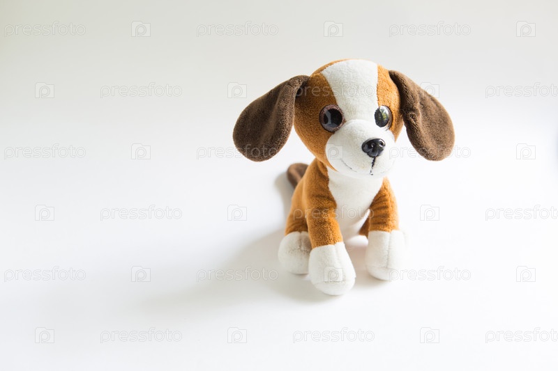 Плюшевая мягкая игрушка собачка коричневого цвета с белой мордочкой и лапками, темными ушами. Детский игрушечный щенок на белом фоне