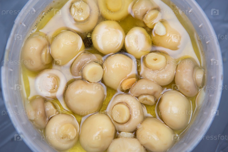 Маринованные грибы в стеклянной банке. Закуска крупным планом в масле и рассоле
