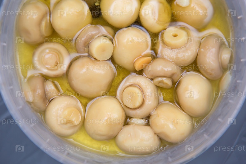 Маринованные грибы в стеклянной банке. Закуска крупным планом в масле и рассоле