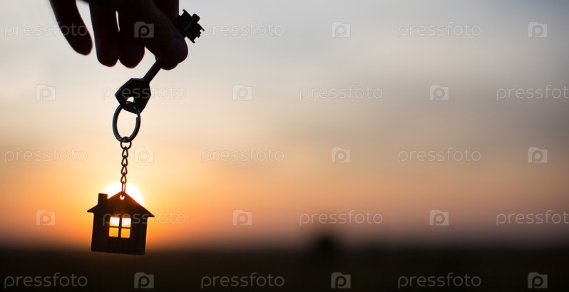 Силуэт фигуры дома с ключом, ручка с брелком на фоне заката. Мечтают о доме, строительстве, переезде в новый дом, ипотеке, аренде и покупке недвижимости. Копировать пространство