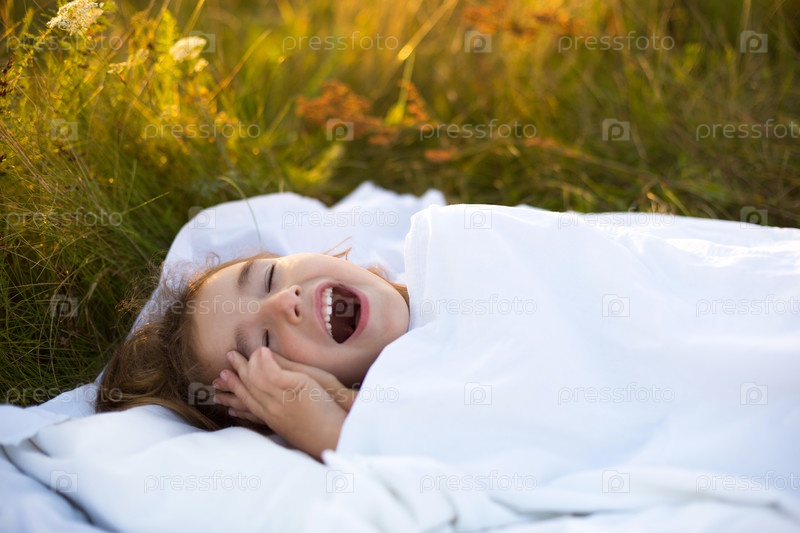 Девушка спит на кровати в траве, Мила потягивается и сонно зевает, доброе утро на свежем воздухе. Экологичность, здоровый сон, Защита от комаров, чистая природа, экология, здоровье детей