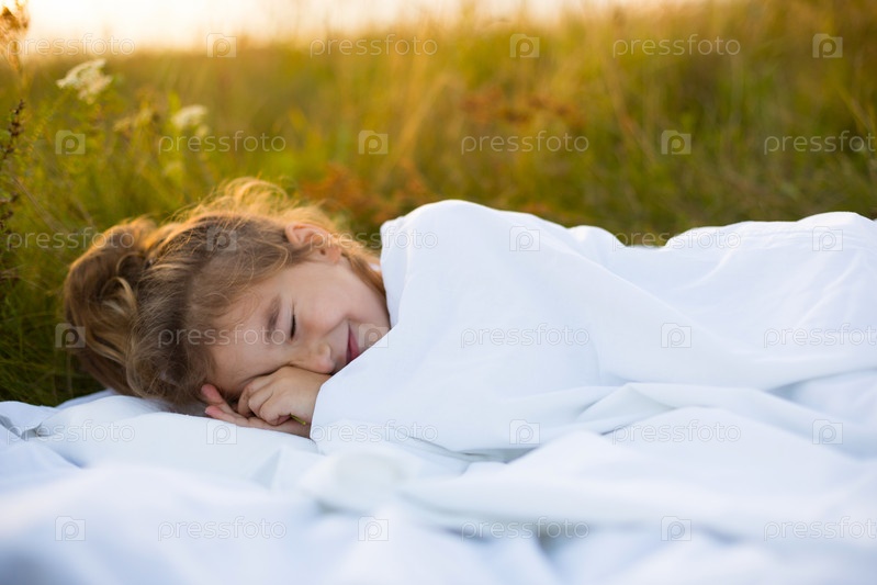Девушка спит на белом постельном белье на природе в траве, на свежем воздухе. Защита от комаров, здоровый сон, польза проветривания, закаливание, чистая природа, экология, здоровье детей