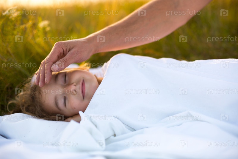 Девушка спит на белой кровати в траве, на свежем воздухе. Папина рука нежно гладит его по голове. Уход, защита, Международный день защиты детей, укусы комаров